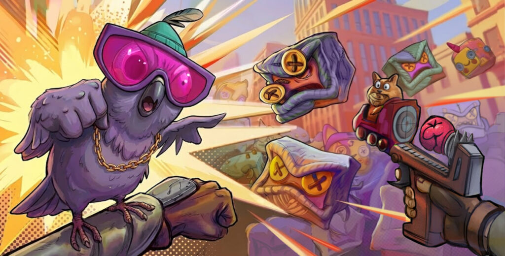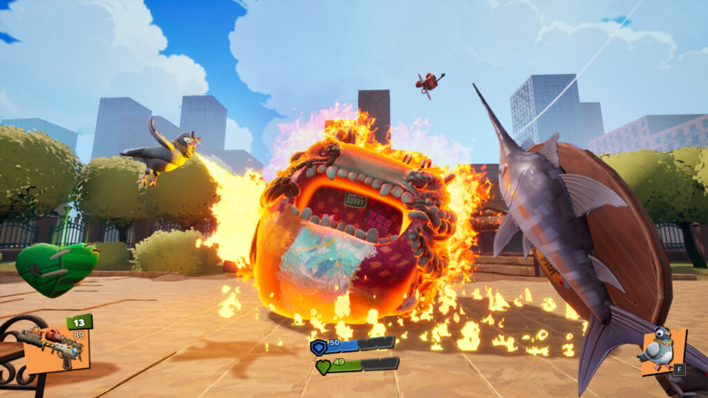 Арсенал намеренно странный и подчёркнуто несерьёзный. В ход идут «Хомяк-дробовик», пулемёт и «рыба-меч» для ближнего боя. Компанию главному герою составляет говорящий Голубь — дерзкий, болтливый и далеко не декоративный: по заверениям разработчиков, его способности ощутимо влияют на ход схваток.
